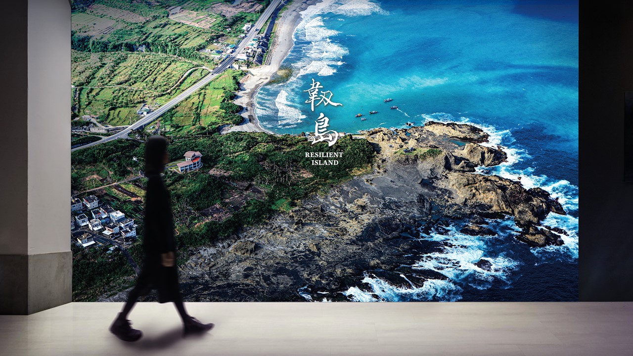 今年度的《韌島》特展,展覽分區包括「島嶼的每一日」、「發生的那一日」、「擾動大地的我們」、「韌島上的明日」與常設展區「成為一片寬廣的齊柏林」。展覽開頭以齊導空拍鏡頭下的台東烏石鼻海岸為主視覺,董陽孜老師的書法破題;烏石鼻當地部落在不斷變動的海岸環境中,捨棄以人定勝天的思維興建防波堤、改善漁港的靜穩度,而是將船隻停在內海區,再以小型竹筏進行接駁。學習在日常生活中所求有度,與自然共生的動態平衡,便是《韌島》展兩大關鍵字「韌性」與「共融」的體現。