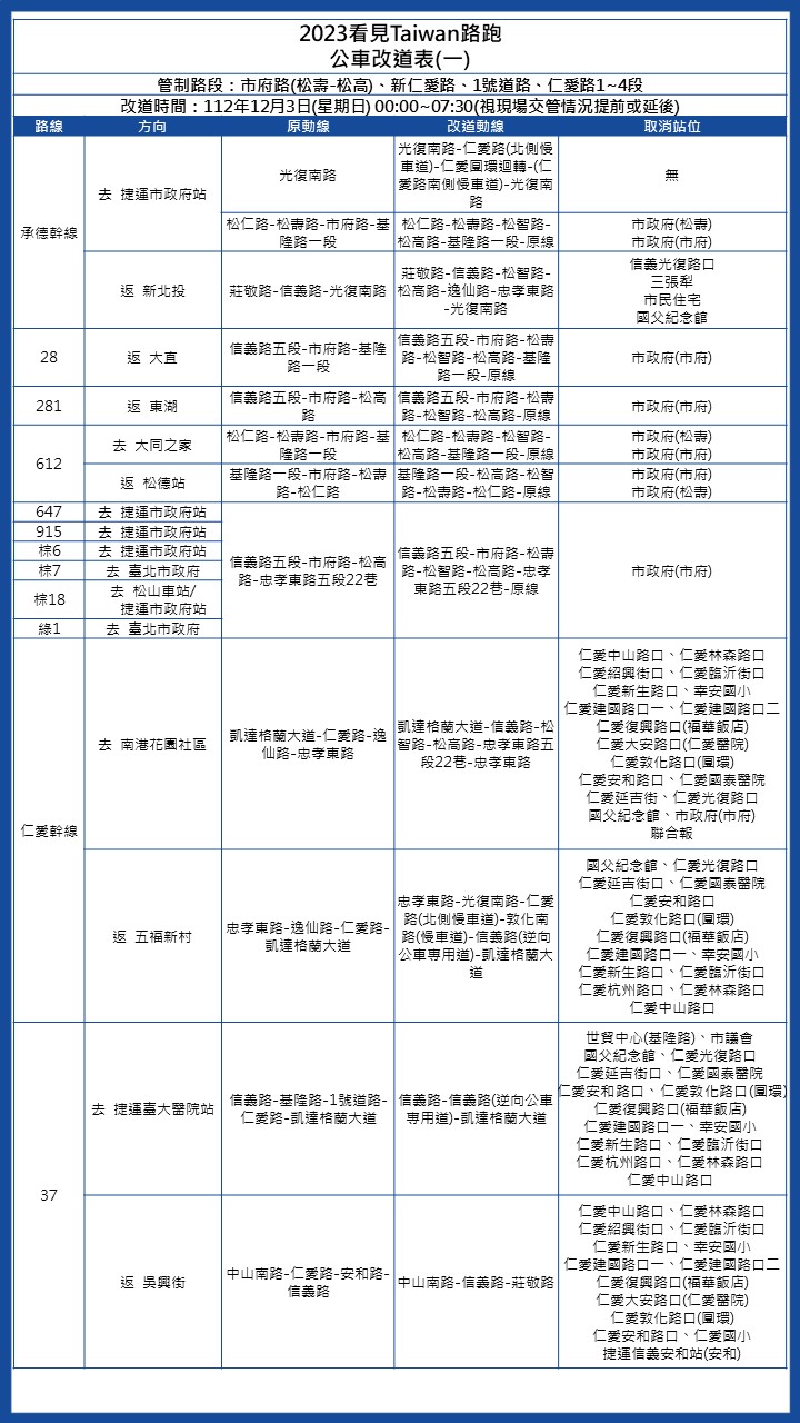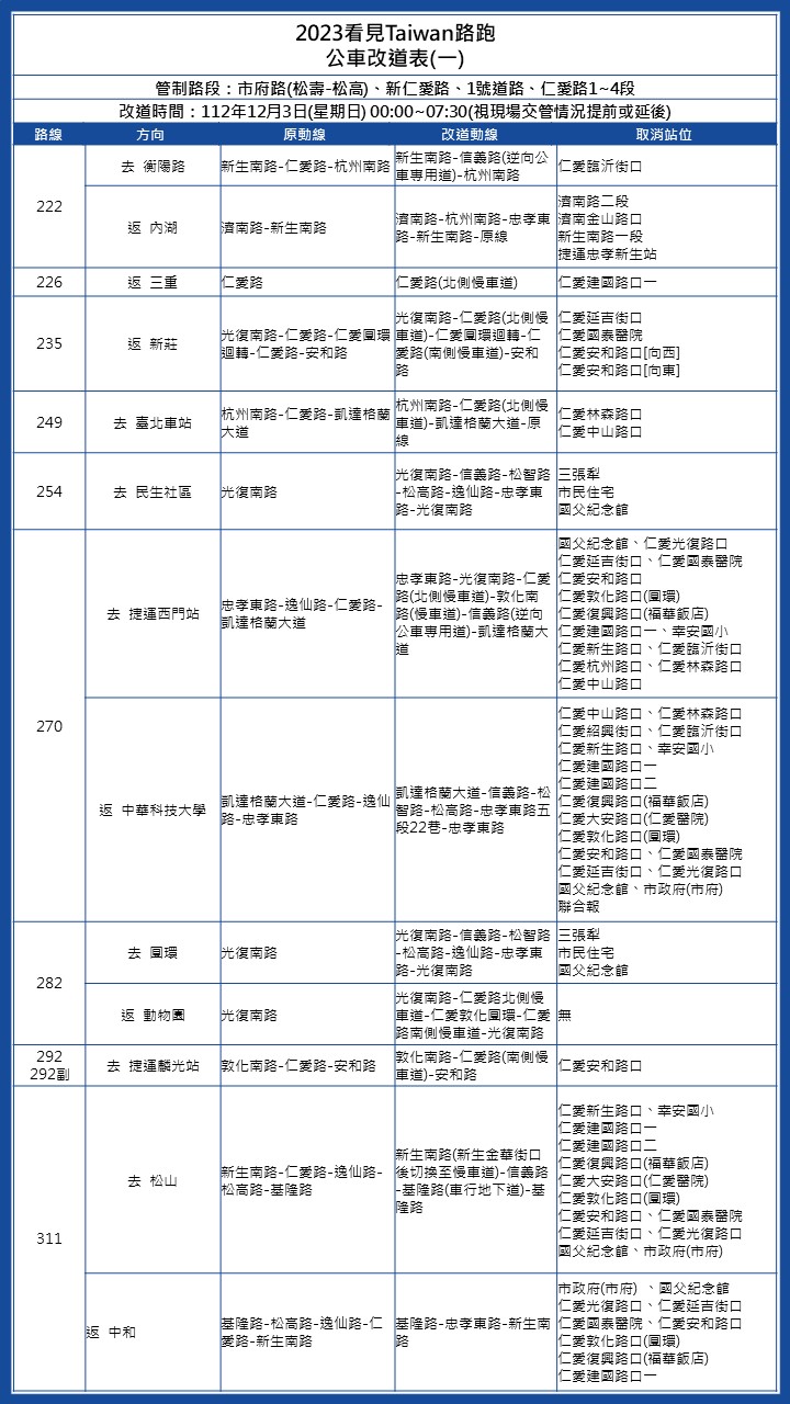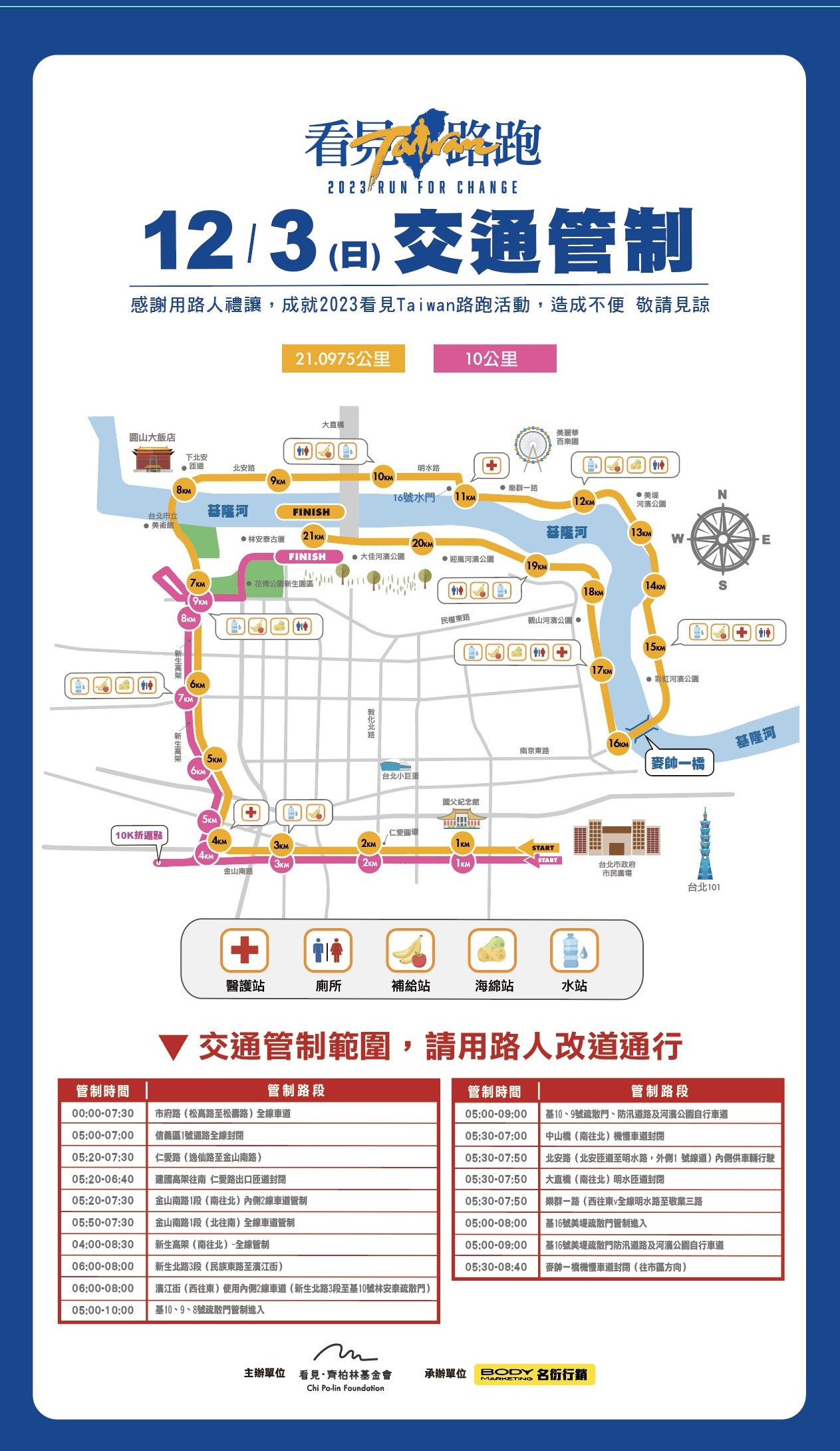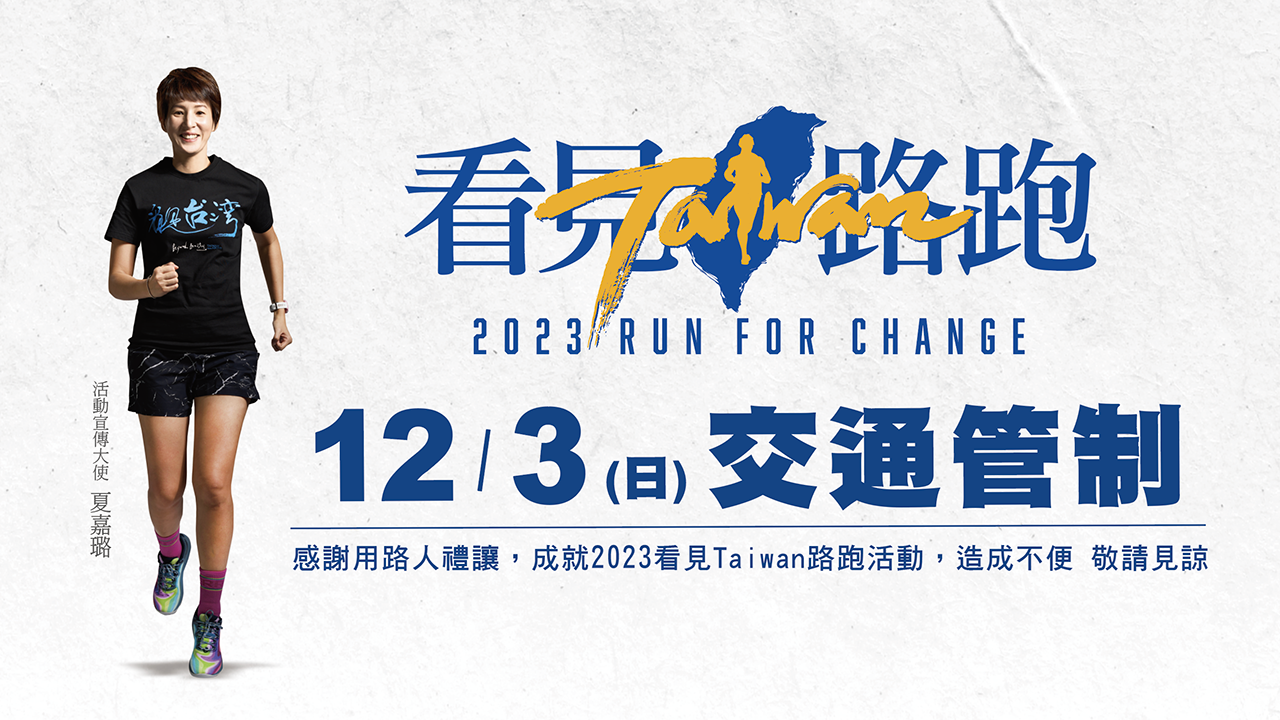 看見·齊柏林基金會主辦《看見台灣》電影十週年紀念路跑活動「2023看見Taiwan路跑」將於12月3日進行交通管制,交管路線及時間請見下圖,造成不便敬請見諒。