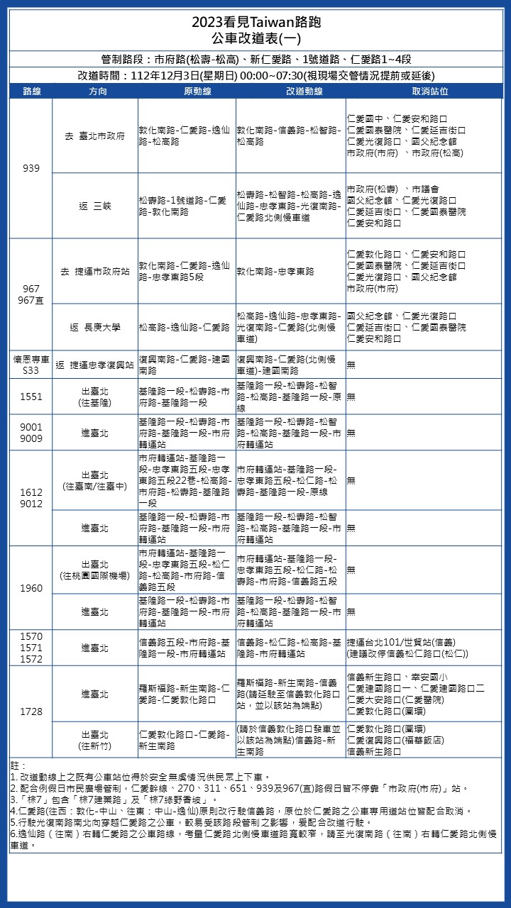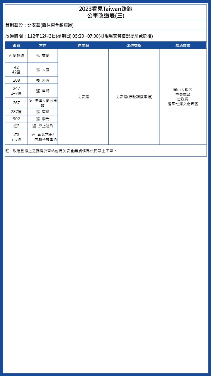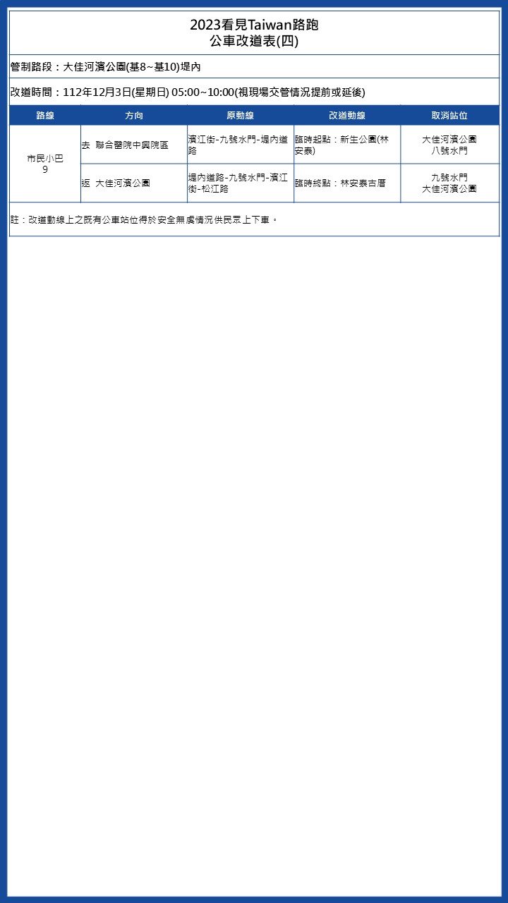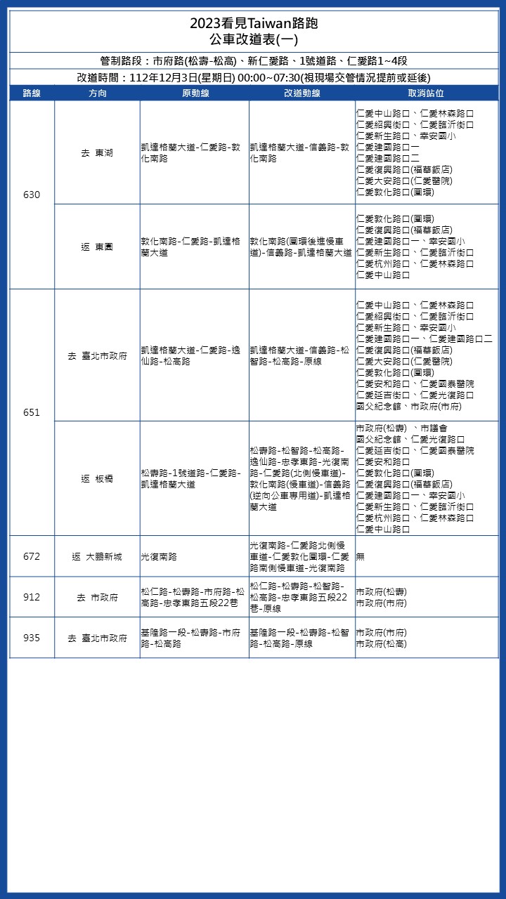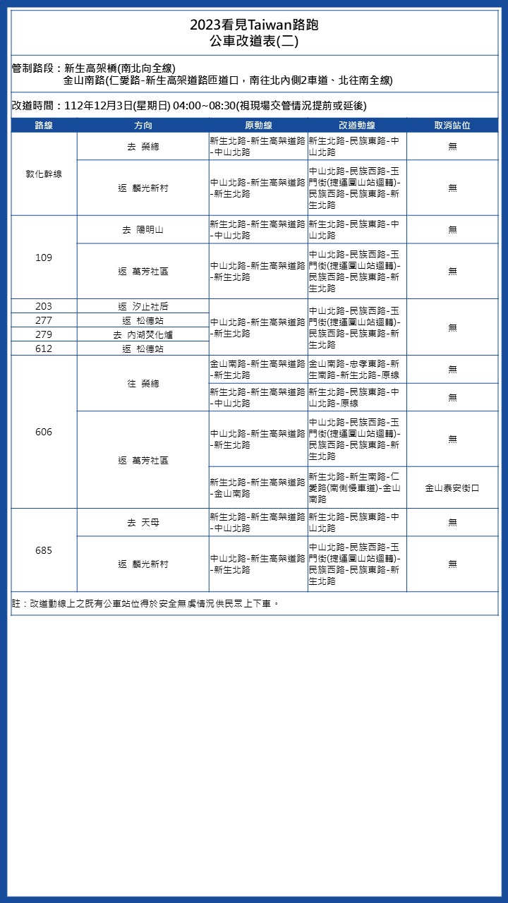 看見·齊柏林基金會主辦《看見台灣》電影十週年紀念路跑活動「2023看見Taiwan路跑」將於12月3日進行交通管制,交管路線及時間請見下圖,造成不便敬請見諒。