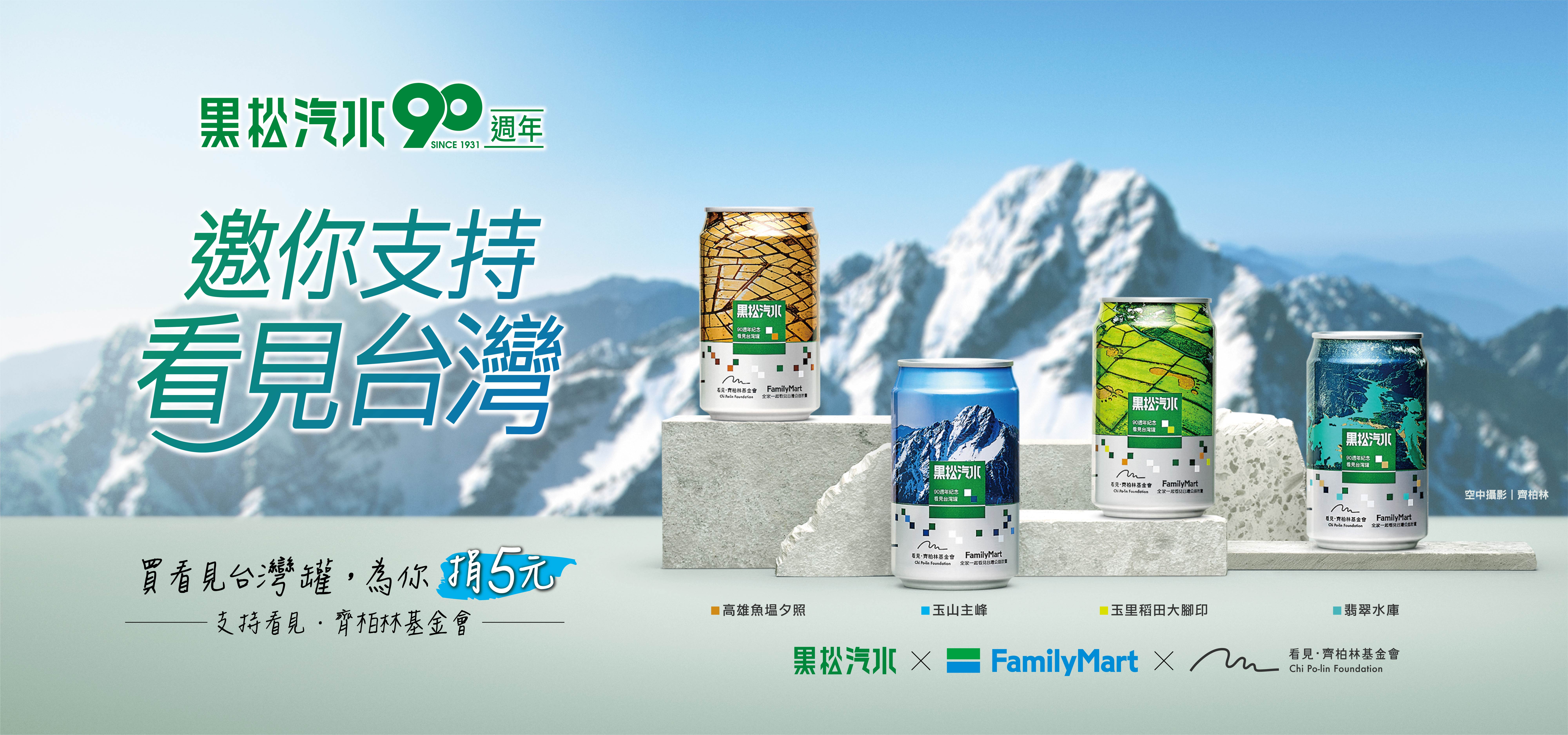 黑松深耕台灣,2021年適逢黑松汽水90週年,為了讓更多人看見台灣,特別與全家便利商店及基金會三方合作,推出四款印有齊柏林導演空拍作品的「90週年紀念看見台灣罐」,於全家便利商店獨家販售。 透過黑松汽水「看見台灣罐」,除了讓更多人看見北、中、南、東各具特色的台灣之美,每售出一罐,黑松就為消費者捐出5元,支持基金會推動環境教育,讓全民一起投入關懷環境、守護台灣的行列! 了解詳情>> 黑松汽水「看見台灣罐」活動官網