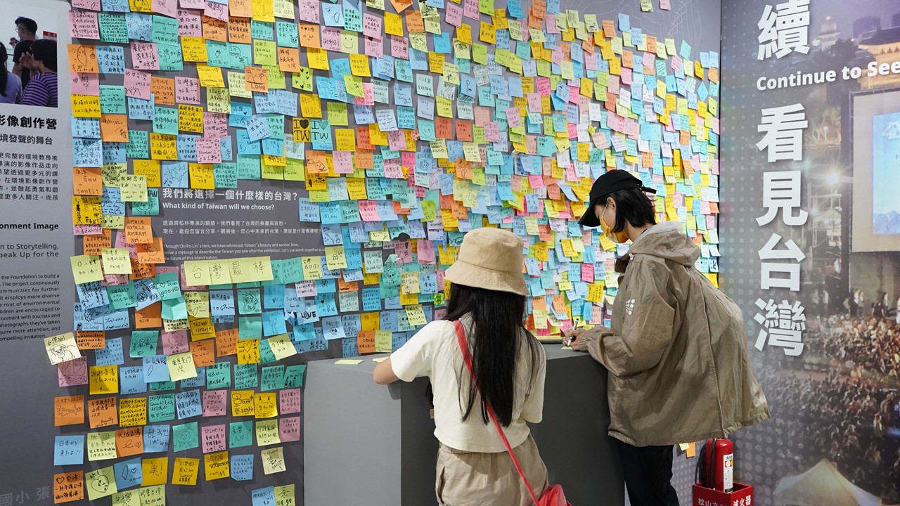 每一雙專注的眼神都閃閃發光,閃爍著對台灣山、河、海、城市的歎為觀止,時而在影像前沈思,時而拋出疑問與導覽老師互動,並在展覽最後,親手在便條紙上,寫下一句句發自肺腑的感言,貼在留言牆上。