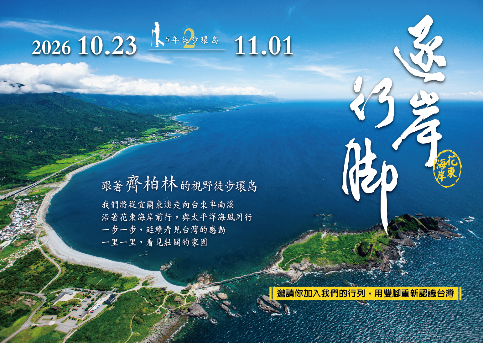 為回顧《看見台灣》的感動,2020年我們徒步走過蘇花海岸,今年將開啟5年5段行腳壯遊,從北濱到東濱公路,南迴到西濱海岸,總長超過1200公里,親眼看見齊柏林曾經看見的,發現你還未發現的台灣之美!徒步土地的感動,每一步都是與自己最真誠的對話;徒步看見的風景,集結眾人的力量,創造屬於台灣的改變!